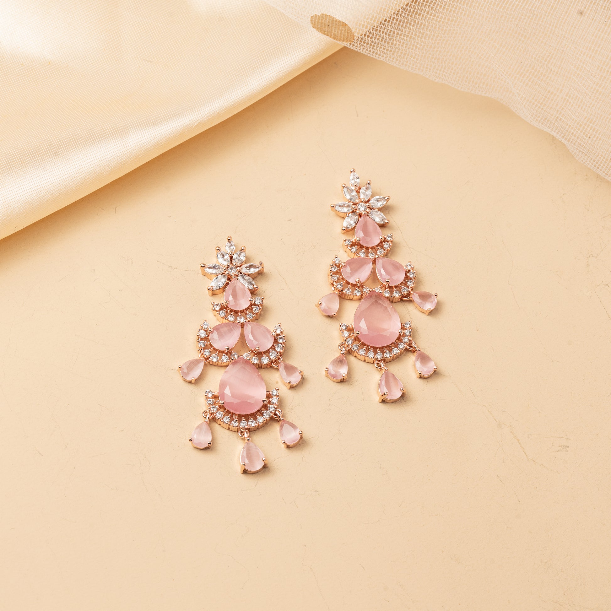 A softly contoured necklace design that sweeps along the neckline with a refined band of closely set elements, transitioning into a layered arrangement of petal-shaped motifs. The cascading sequence creates depth and gentle movement, offering a romantic yet structured flow. Paired with matching drop earrings, this set feels poised and graceful-an elegant balance of softness, rhythm, and refined detail.