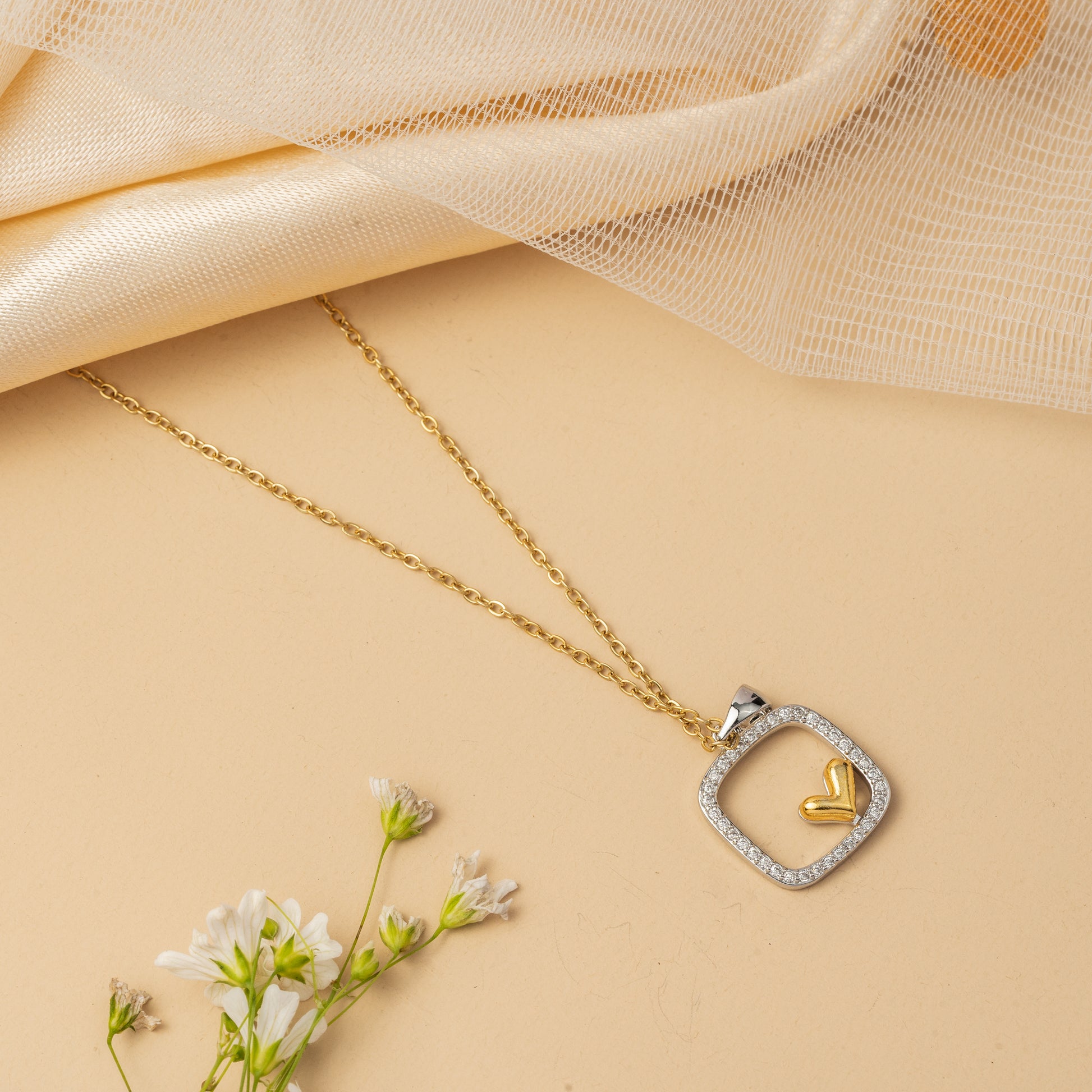 A modern open-frame pendant shaped in a soft square silhouette, cradling a delicately suspended heart motif at its center. The contrast between the structured outline and the free-floating inner element creates depth and visual intrigue, symbolizing balance between strength and softness. Suspended from a fine chain, this design feels minimal yet expressive-an elegant statement of subtle emotion and refined form.