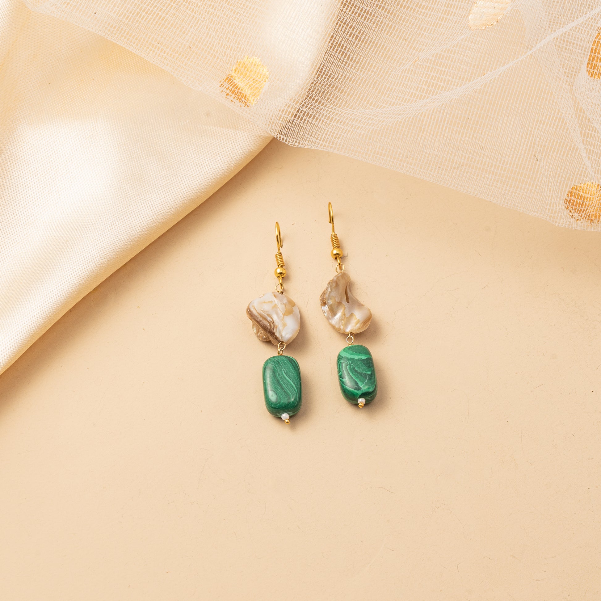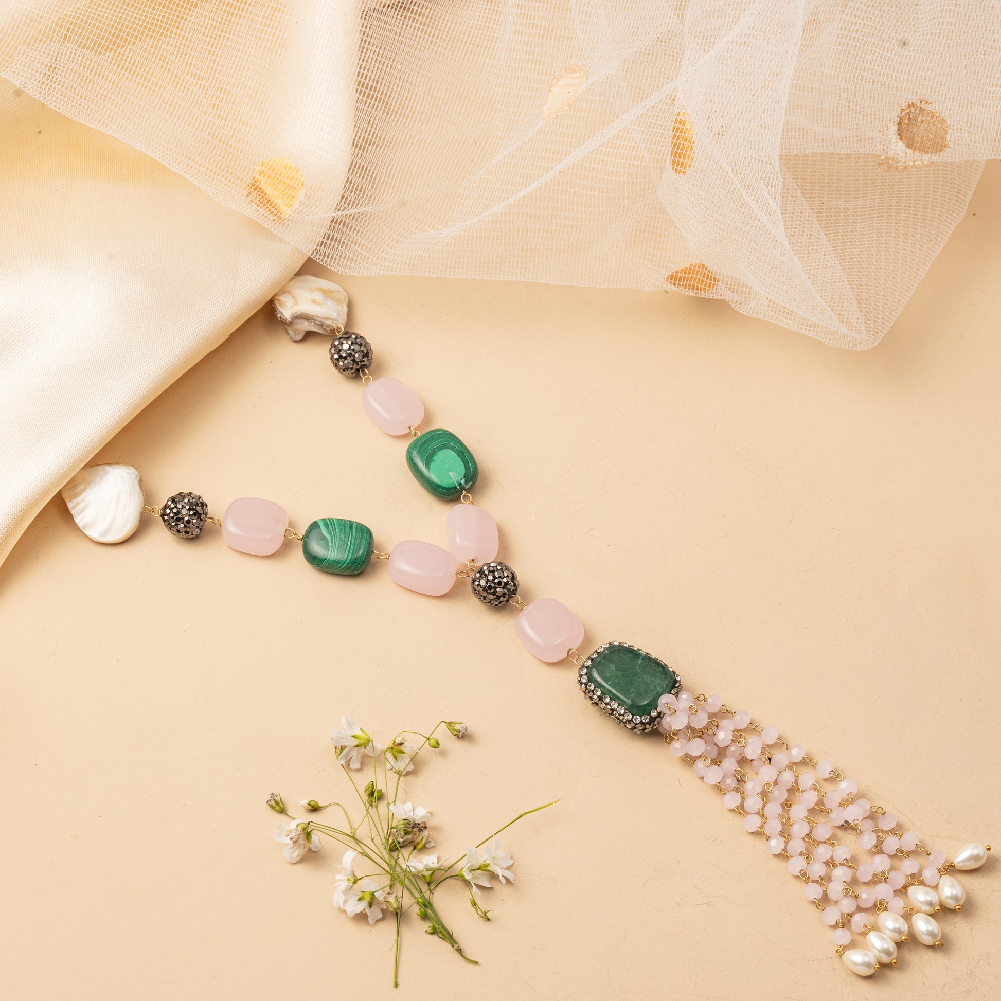 A thoughtfully composed necklace that blends rounded and oval elements in a flowing sequence, creating a gentle interplay of shapes and textures. The design culminates in a cascading fringe of delicate strands, adding graceful movement and visual depth. Paired with coordinating drop earrings, this set feels artistic and balanced-an elegant fusion of rhythm, softness, and refined expression.