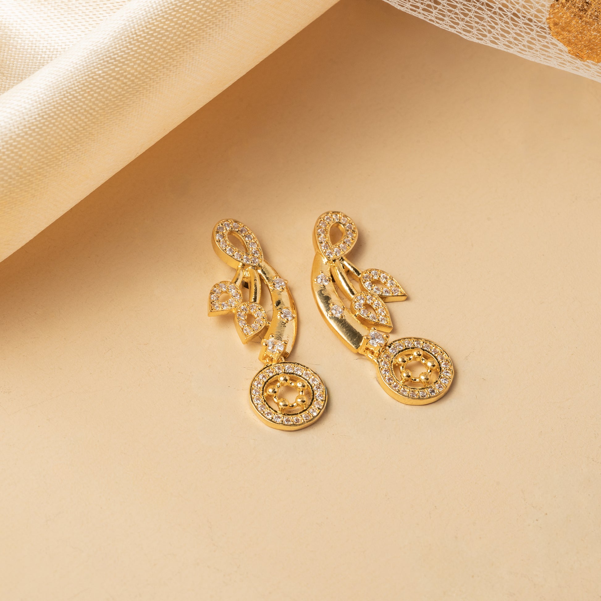 A gracefully layered collar-style necklace featuring flowing bands adorned with repeating oval motifs that create a sense of gentle movement across the neckline. The design tapers into a softly detailed circular drop, adding a refined focal point without overpowering the layered rhythm. Paired with complementary drop earrings, this set embodies fluid elegance-balanced, expressive, and effortlessly luminous.